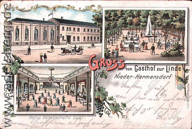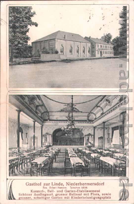 "Gasthof zur Linde", Niederhermersdorf gelaufen 12.08.1923, Stempel Gablenz, Kunstanstalt Wilh. Ackermann, Hohenstein-Erntthal Gedruckter Text auf der Karte: "Gasthof zur Linde", Niederhermersdorf, Bes. Robert Hamann, Telephon 5806, Konzert-, Ball- und Garten-Etablissement, Schöner Ausflugsort, grosser Ballsaal mit Flora, sowie grosser, schattiger Garten mit Kinderbelustigungsplatz" |