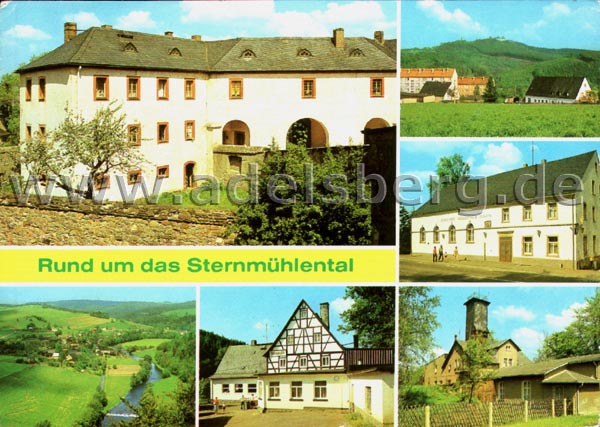 Rund um das Sternmühlental, 1980 Farbfoto: Frenzel, Karl-Marx-Stadt Abbildungen: Schloß Augustusburg- Torhaus, Blick vom Kunnerstein ins Zschopautal, Gaststätte Sternmühle, Blick von Erdmannsdorf zum Schloß Augustusburg, Gasthof Goldener Hahn, Gaststätte und Ferienheim Adelsbergturm |